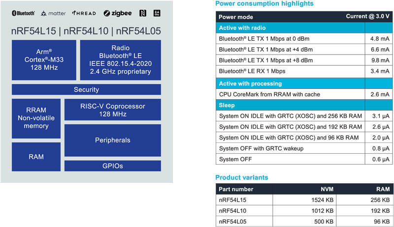 Nordic Semiconductor features the nRF54L15, nRF54L10, and nRF54L05 which make up the nRF54L Series. All wireless System-on-Chip (SoC) options in the series integrate an ultra-low power multiprotocol 2.4 GHz radio and MCU (Microcontroller Unit) functionality featuring a 128 MHz Arm® Cortex-M33 processor, comprehensive peripheral set, and scalable memory configurations up to 1524 KB NVM and up to 256 KB RAM.